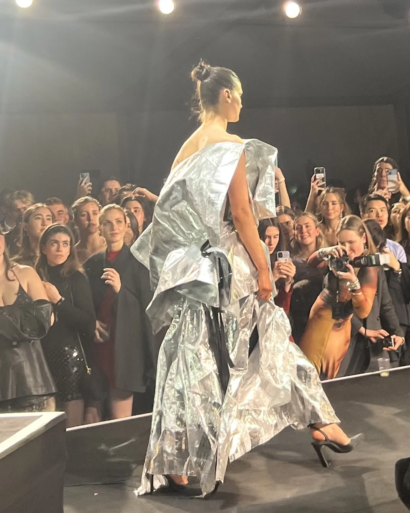 The show commenced with an impressive choreography sequence which set the energy levels high. Models initially paraded in all-black outfits, though soon transitioned to reveal more colorful and avant-garde looks. A standout piece was a gathered silver metallic dress, “LOOK 6 - The Ballgown” from Valentin Schwarz’s MA Graduate Collection at Aalto University. The black ropes hanging from the dress allude to Schwarz’s innovative patterning technique which allow his garments to be adjusted to fit any body type.