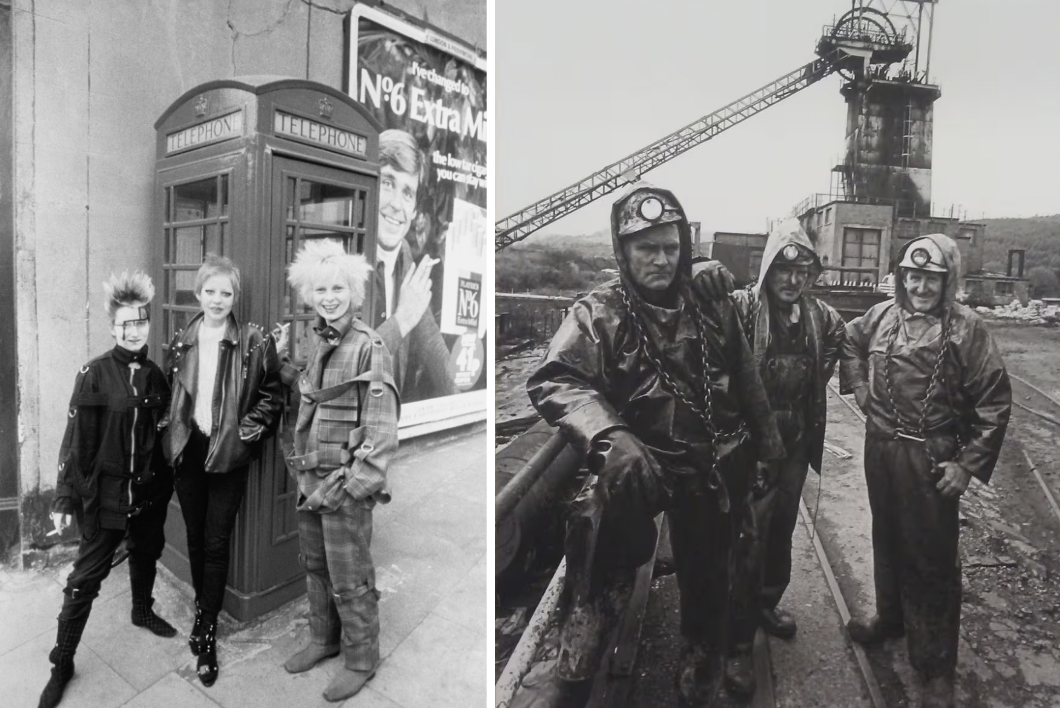 Vivienne Westwood street style, 1977 (left), and Salvage men at Abercynon Colliery, 1989 (right)