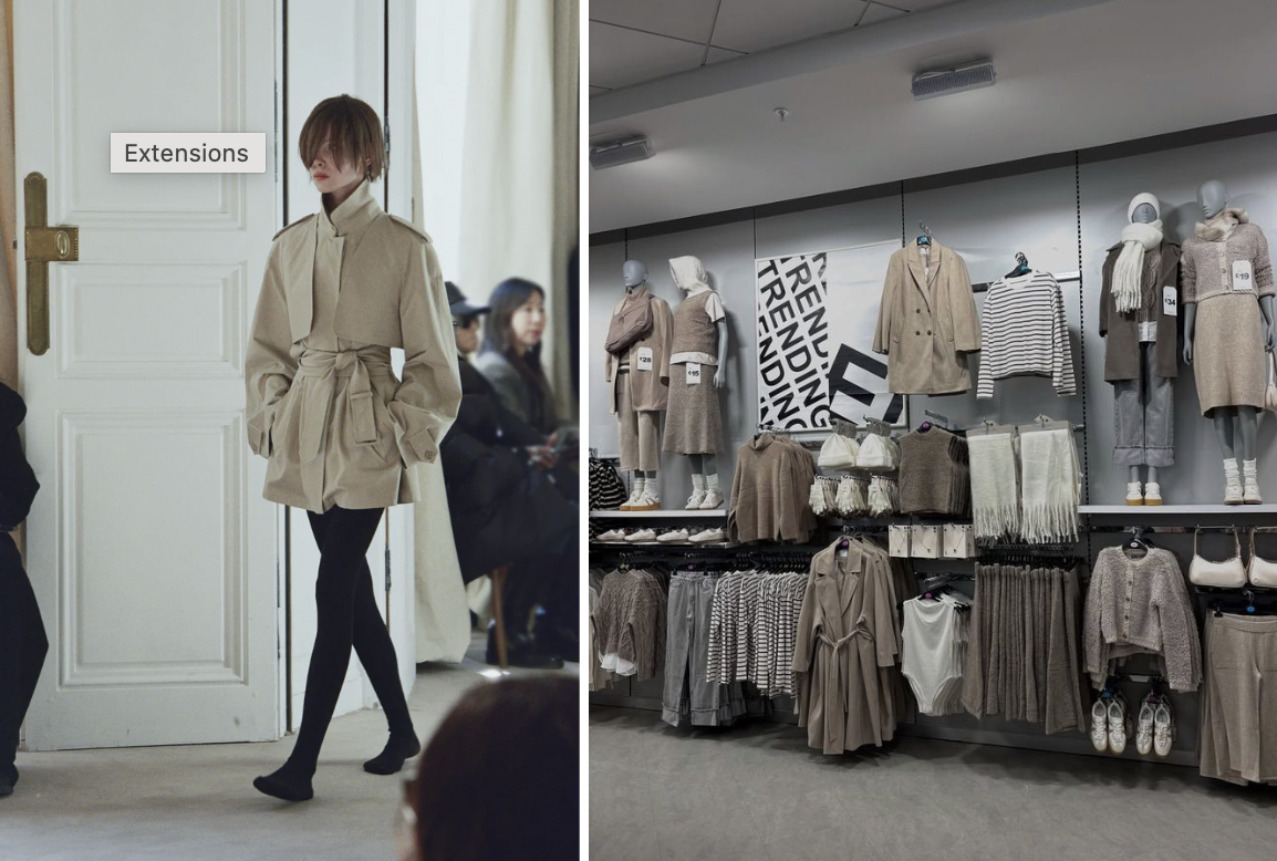 The Row, look 20 for Women’s Winter Collection, 2025 (Left); Primark winter neutrals, 2024 (right)
