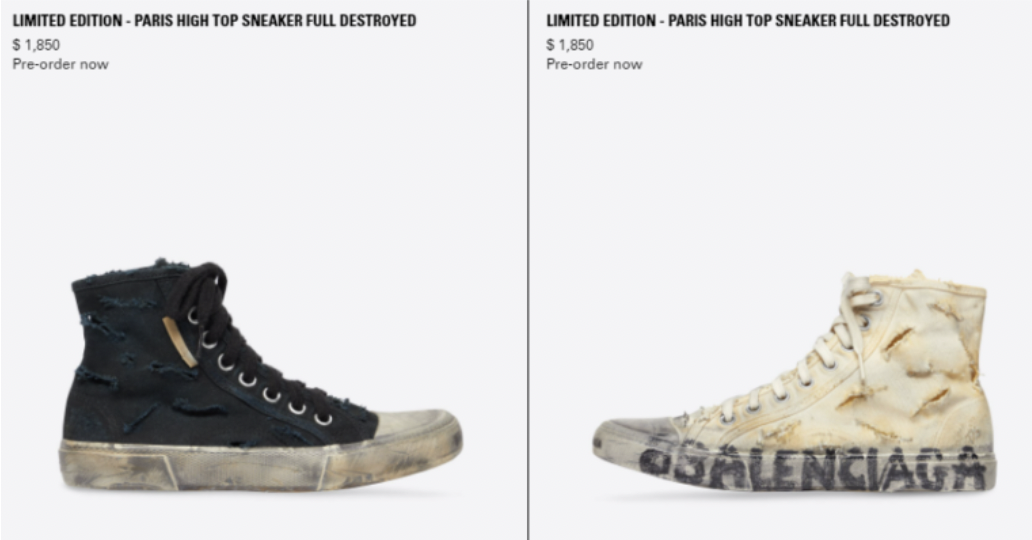 Balenciaga’s “Paris High Top Sneaker Full Destroyed” in black and white courts controversy for aestheticising poverty for a high price tag