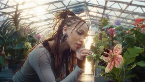 In a sequence in which FKA twigs wears the new Origami eyewear model, she is stung by a strange, alien-looking flower, triggering a transformation. Ethereal vocals set in as the campaign shifts to a choreographed white cutscene in which she pole dances around the stem of a blooming flower. The sequence culminates in a close-up of FKA twigs’ face with the Bouquet 02 flower glasses, before cutting back to the greenhouse. Only now does the Gentle Monster logo appear. The campaign thus evokes experimental cinema rather than conventional advertising – linking film, music and dance performance through the interaction between humans and nature.