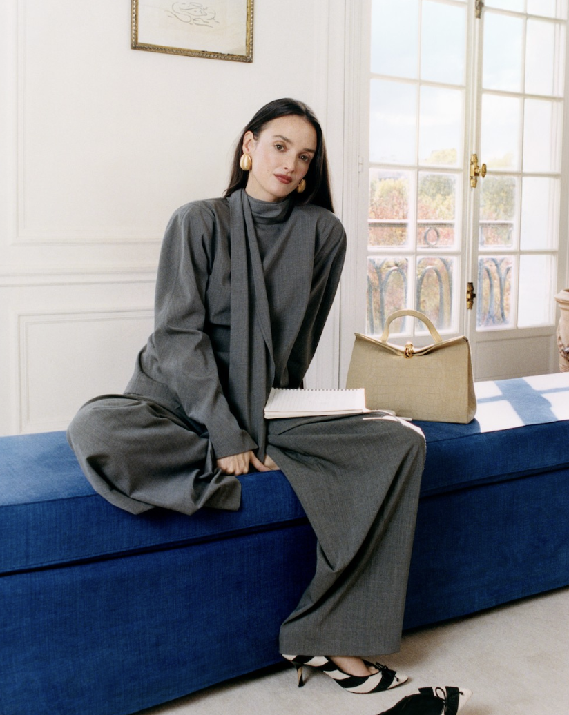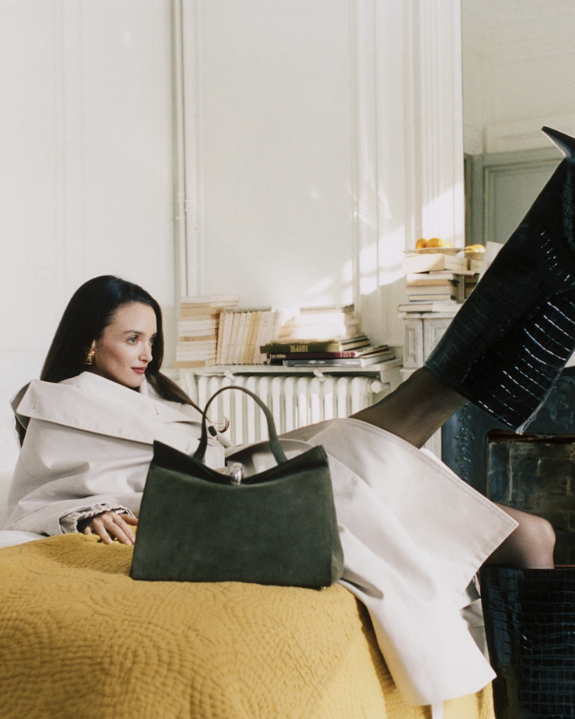 The recent ad campaign for the new Valérie handbag features a series of short, snapshot-style videos of White Lotus actor Charlotte Le Bon acting out various everyday scenes. All shot from a low angle, imitating the perspective of a young child, the videos follow Le Bon around a quintessential Parisian apartment. In one, the camera slowly approaches while Le Bon sits on an ottoman, taking a business phone call. The shot closes in on the notebook she is doodling in, revealing multiple drawn iterations of the bag’s name, ‘Valérie’, and a single flower. Another depicts Le Bon hurrying down a hallway with arms full of grocery bags and dry cleaning, and of course, a butter-yellow Valérie bag. Scattering the objects on the floor, she greets the child through whom the scene is shown and hurries into the bathroom. A bag of vegetables is knocked over by the closing bathroom door, and the clip ends with a still-life composition: one grocery bag upright, the other spilling over onto the parquet floor, and the simple, stylish Valérie purse casually propped on the side.